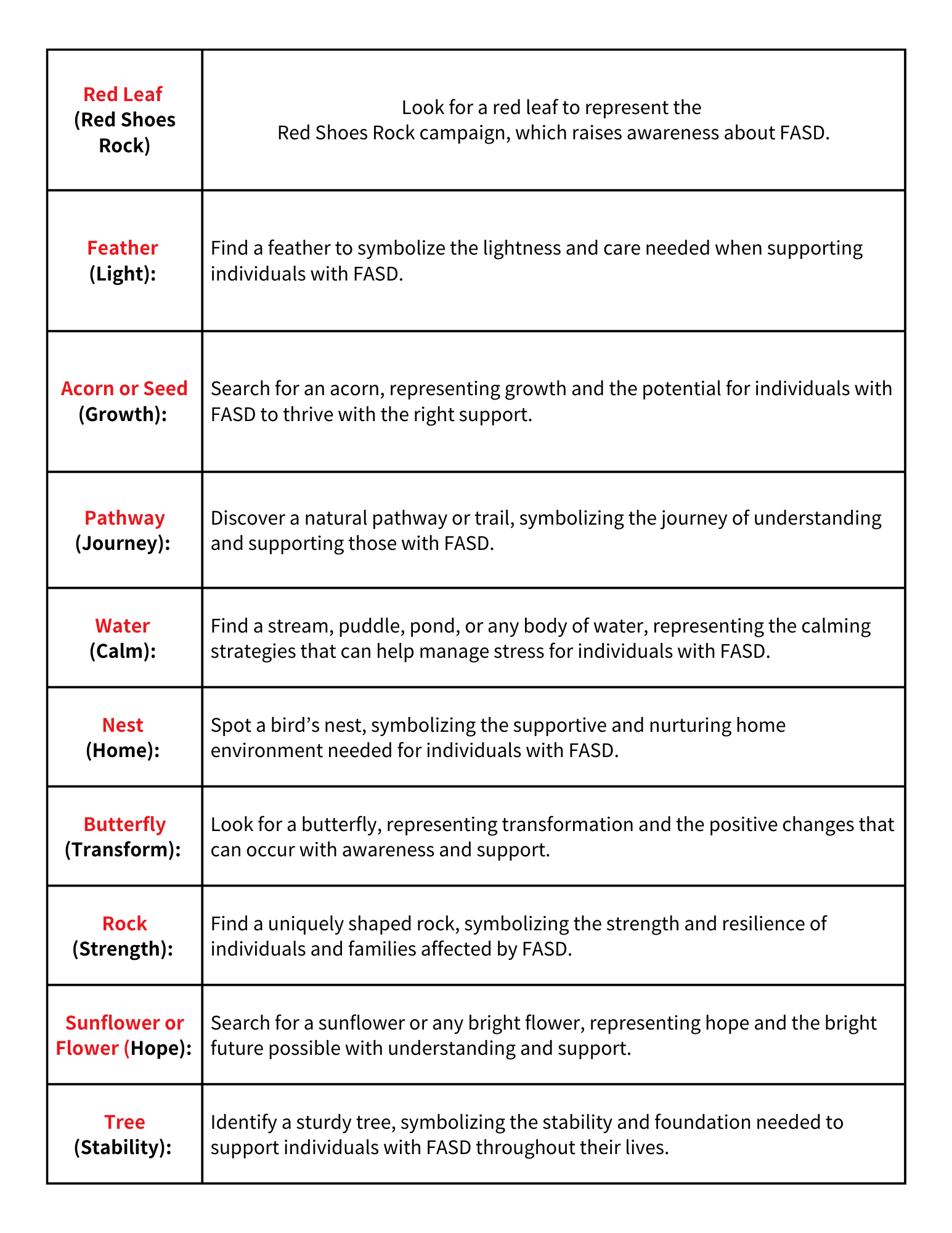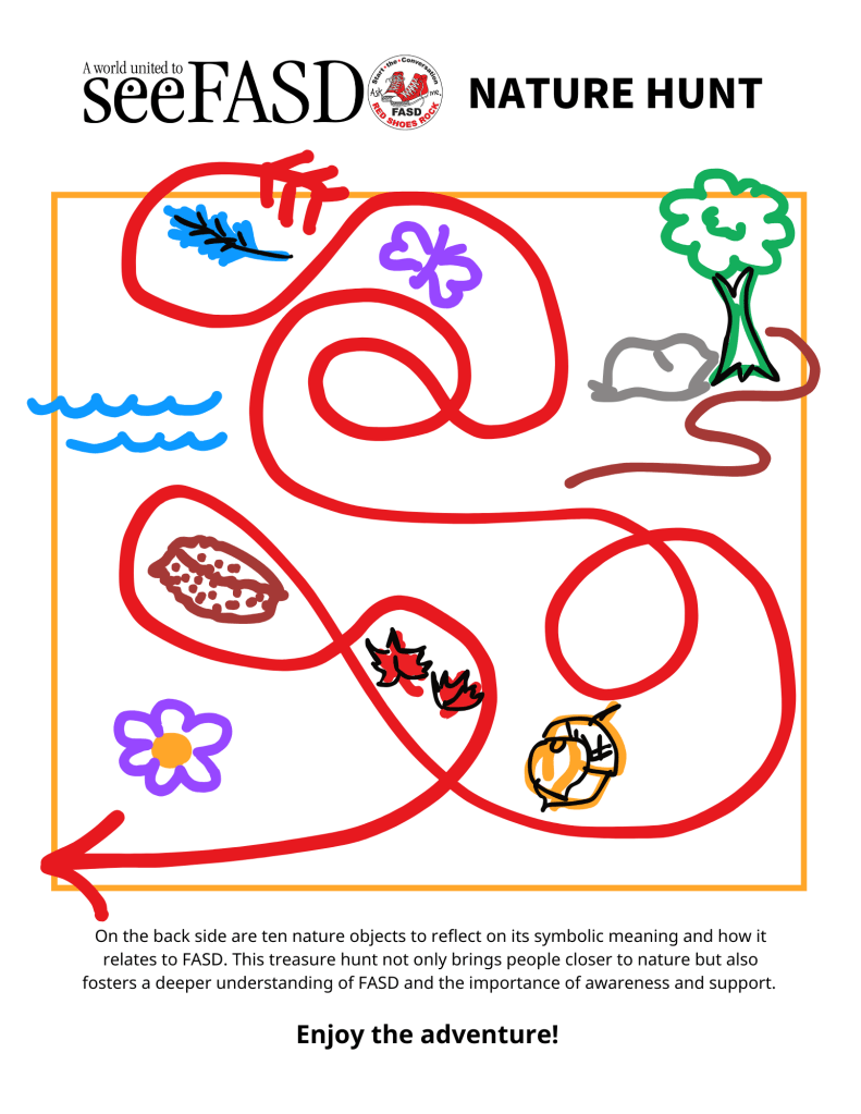Plan a nature walk with friends or family and use the time to discuss FASD. Bring along some printed materials or share facts along the way. It’s a great way to enjoy the outdoors while raising awareness! Feel free to copy and print example below.